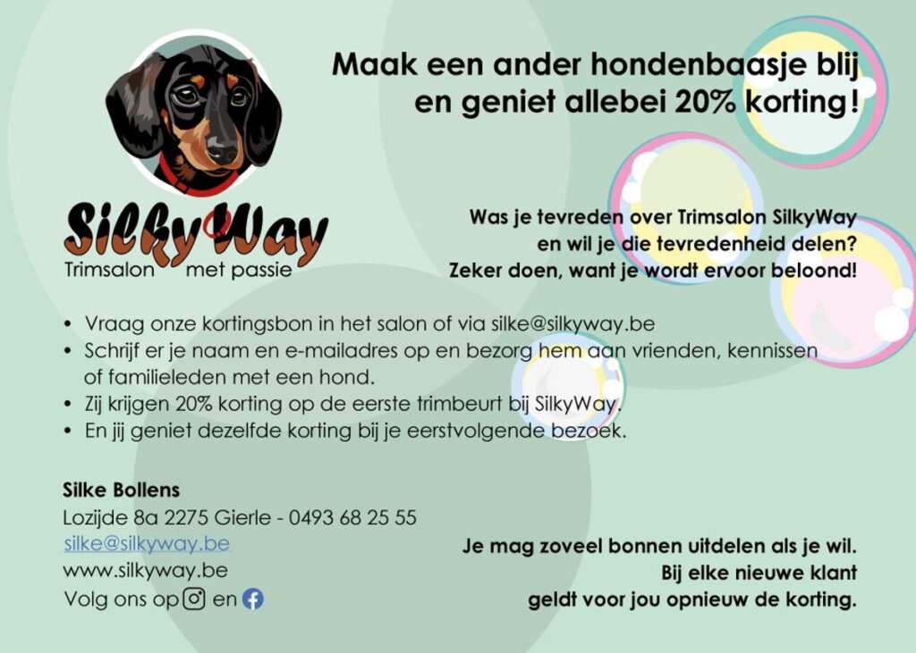 Groot of klein, puppy of ‘senior’, lang- of kortharig, angstig of niet … bij SilkyWay, voelt elke hond zich thuis. In haar tiny trimsalon neemt Silke Bollens de huid- en vachtverzorging van je viervoeter professioneel in handen. Attent en vol passie.